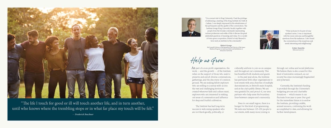 The King Institute for Faith & Culture program booklet highlighting the institute’s origins, guest speakers, and impact on the students and community.